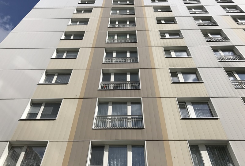 3. Die PVDF-Lackierung an der Vorderseite der Farbaluminium-Paneele hat eine „natürliche Abkreidung“. Jedes Jahr wittern wenige Bruchteile eines µ von der Oberfläche ab. Schmutz und Staub können sich daher nicht auf der Oberfläche halten - die Fassade bleibt immer sauber. Auch kann sich die Oberfläche aufgrund ihrer Konstruktionsweise nicht statisch aufladen. Schmutzpartikel haften deshalb nicht an der Fassade. Eine Lebensdauer von 50 Jahren und länger ist bei Farbaluminium-Fassaden in der Praxis vielfach nachweisbar.